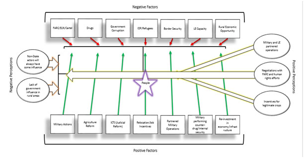 The notions of modifying factors and individual perceptions from the HBM were incorporated into Force Field Analysis, which was then applied to competing forces in Columbian society. These two categories were divided into positive and negative groups, based on how they affect the people of Colombia identified as the center of gravity. Utilizing the Clausewitzian concept of the center of gravity (CoG), defined as, “the source of power that provides moral or physical strength, freedom of action, or will to act,” [xi] planners identified the people of Colombia as the CoG. Ultimately, the people would determine the fate of the country by either accepting or rejecting the controls and measures that the government desired to enact, and accepting or rejecting the influence of nefarious non-state entities.