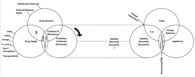 On the Colombian Government portion of the diagram, stability was a required condition of the environment to support trade leading to increased foreign investment, foreign relations, and legitimacy. The model illustrated the source of conflict between the stakeholders as they shared a common thread in the area of stability with threat forces thriving on instability and the Colombian government requiring stability. These two competing VIN diagrams (or stones) have the ability to respond to forces that may cause them to roll towards or away from stability outcomes embodied by the rolling stone title of this theoretical model.