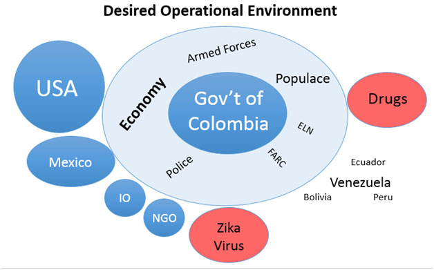 Using a System of Systems Analysis approach, planners were able to accurately define the Operational Environment. This was then combined with a modified version of the Force Field Analysis theoretical model to determine what the resistors and drivers for change were in Colombia and how those forces affected the System of Systems. This combination of theoretical models became the System of Force Fields theoretical model (see figure 5).