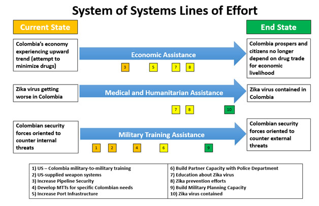 The use of the combination of System of Systems Analysis and Force Field Analysis allowed planners to digest copious amounts of information in a rapid fashion and allowed for nodes and links to be quickly identified. Using this theoretical model permitted the group to focus and gain more clarity in its thinking. Additionally, this clarity of thinking allowed for the group to identify the required lines of effort to achieve the desired end states faster by seeing the interrelated links and nodes and the key resistors to change. By addressing these key resistors, the group was able to develop a synchronized and synergistic operational approach.