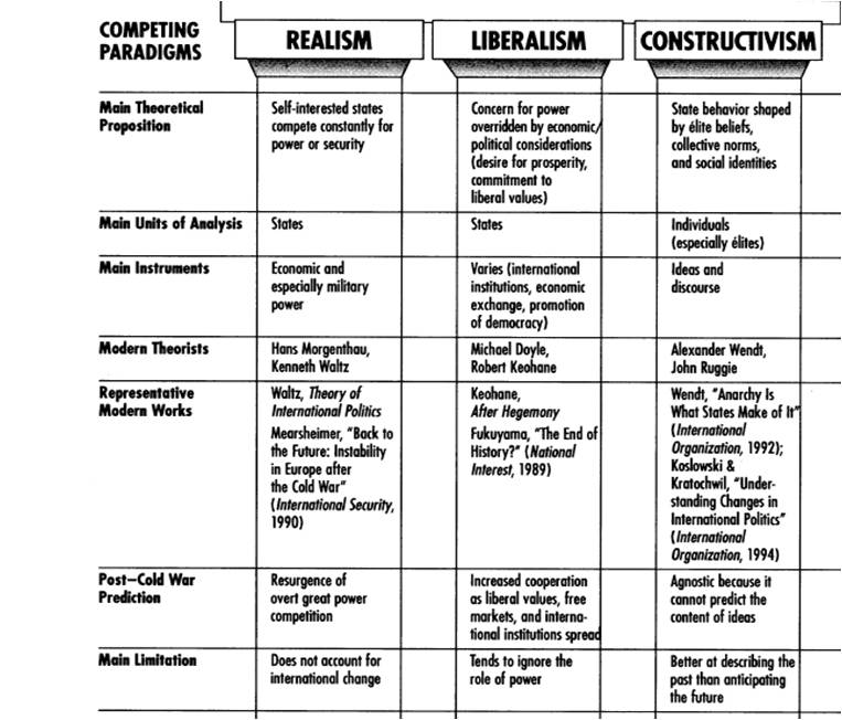 The other term for constructivism is idealism, in short a belief that international politics are shaped by collective values, ideas that are persuasive, culture, identity, and so forth.